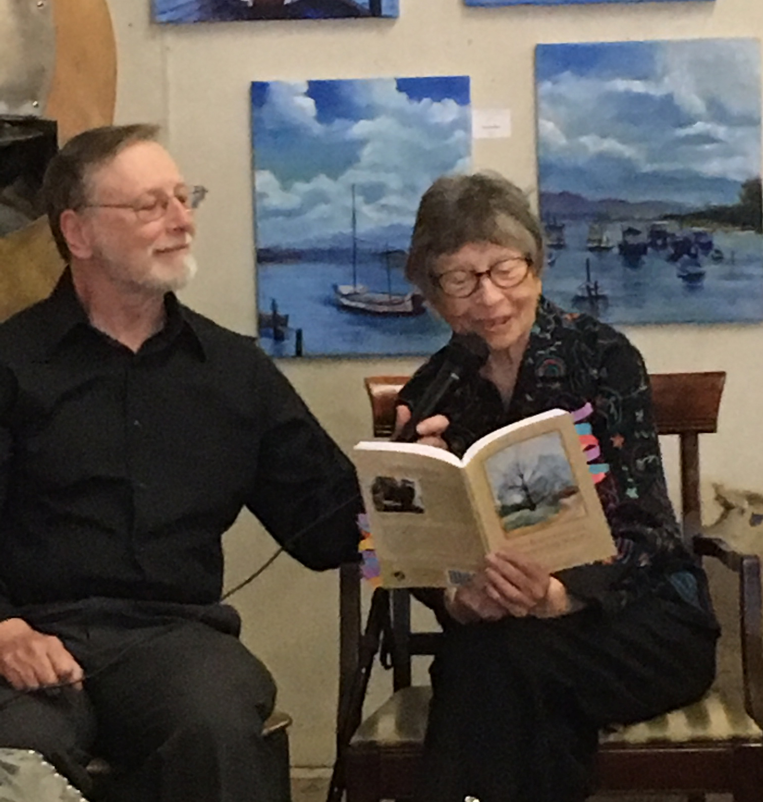 at the book launch held on April 7. Her son David Miller holds the microphone.